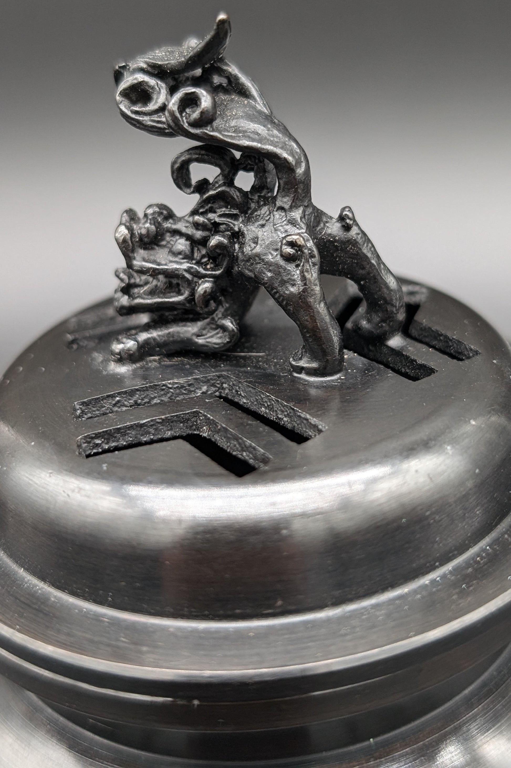 - This is a copper incense burner with Crane and lion decorations.
